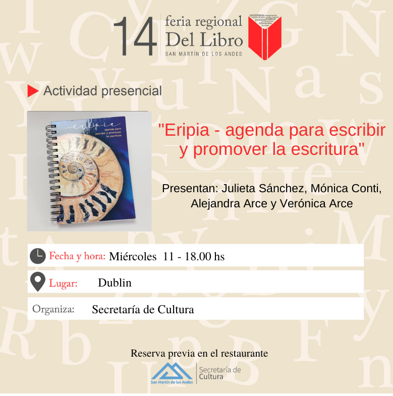 Julieta Sánchez, docente y escritora; Mónica Conti, ilustradora; Alejandra Arce y Verónica Arce, diseñadoras, presentan Eripia, una agenda perpetua con consignas de escritura creativa y frases reflexivas, destinada a quienes les gusta escribir, a quienes quieren empezar a hacerlo y a docentes de lengua y literatura, ya que cuenta con un libro digital gratuito con ideas para promocionar la reflexión metalingüística de las consignas de invención.