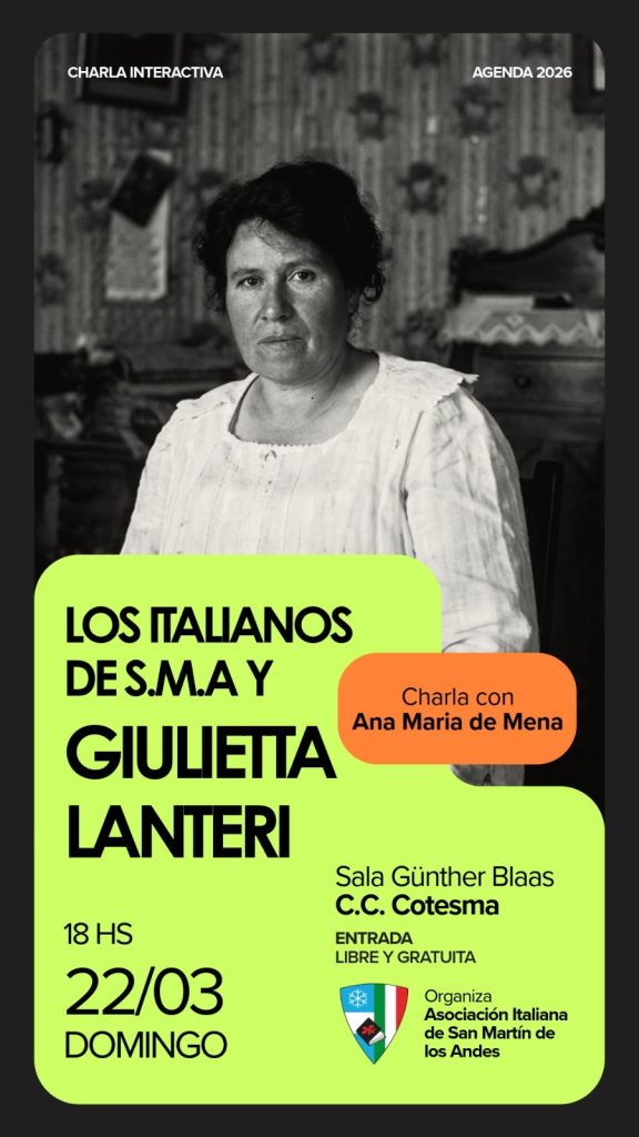 Este domingo 22 de marzo a las 18:00 hs, la Sala Günther Blaas del Centro Cultural Cotesma será sede del encuentro “Los italianos de San Martín de los Andes y Giulietta Lanteri”.
