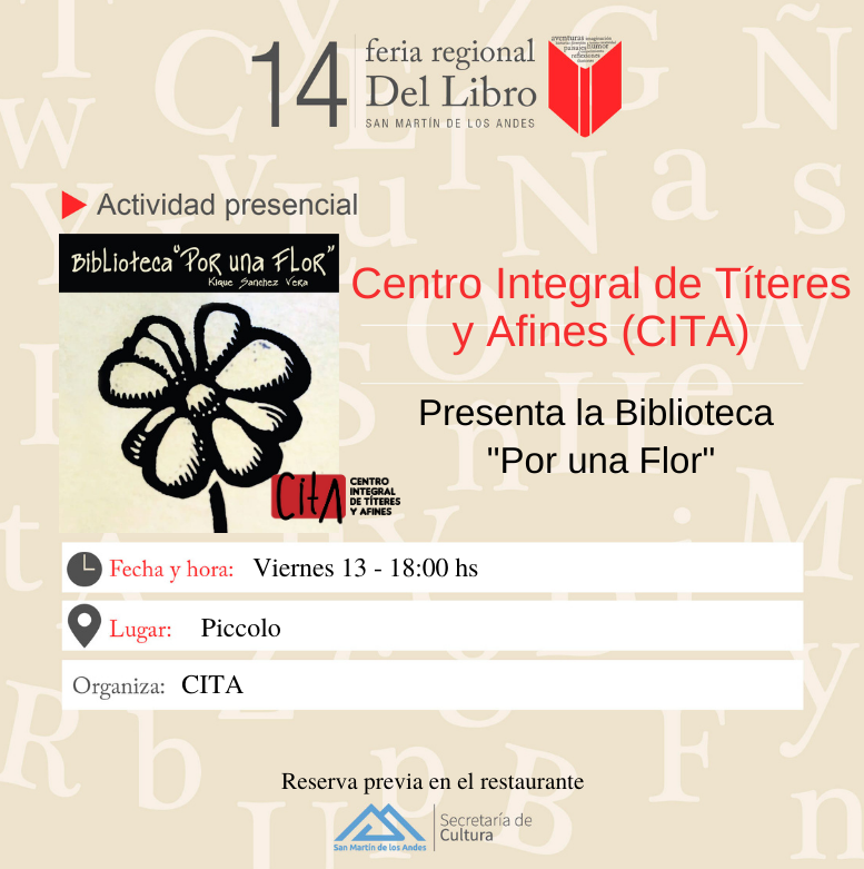 La biblioteca POR UNA FLOR integra las propuestas del colectivo CITA, Centro Integral de Títeres y Afines. Es una biblioteca especializada en artes escénicas y artes en general.